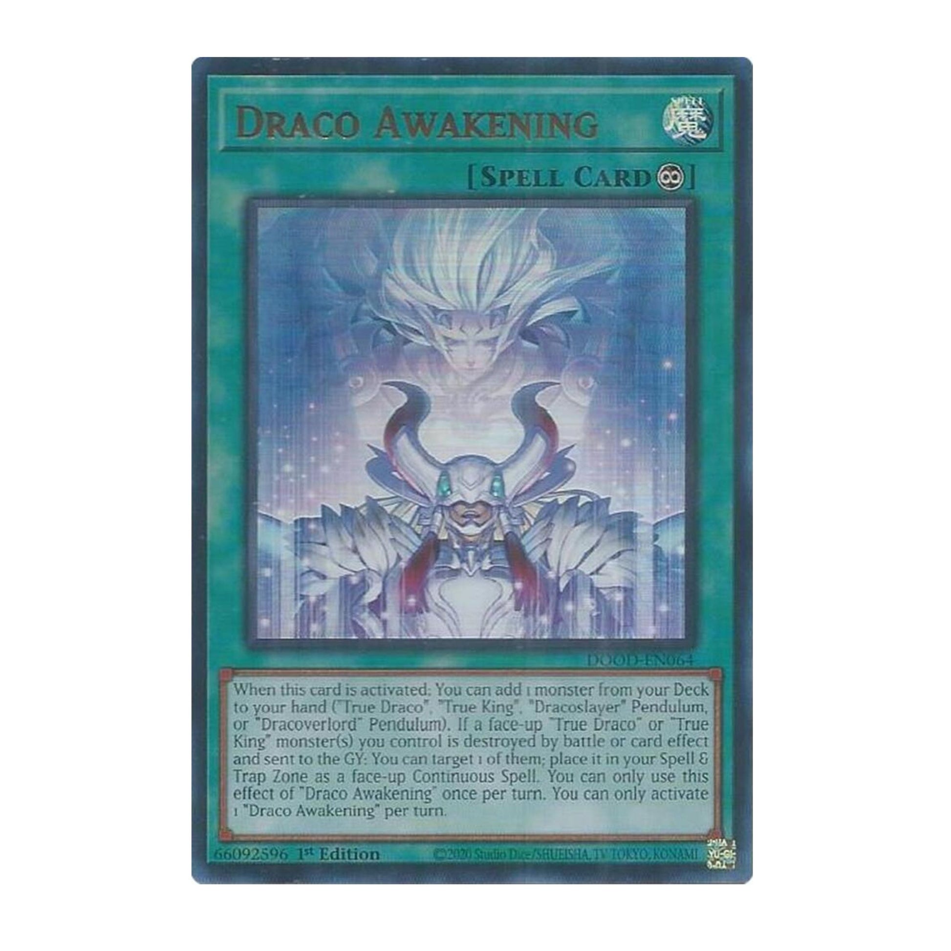 When this card is activated: You can add 1 monster from your Deck to your hand ("True Draco", "True King", "Dracoslayer" Pendulum, or "Dracoverlord" Pendulum). If a face-up "True Draco" or "True King" monster(s) you control is destroyed by battle or card effect and sent to the GY: You can target 1 of them; place it in your Spell & Trap Zone as a face-up Continuous Spell. You can only use this effect of "Draco Awakening" once per turn. You can only activate 1 "Draco Awakening" per turn.