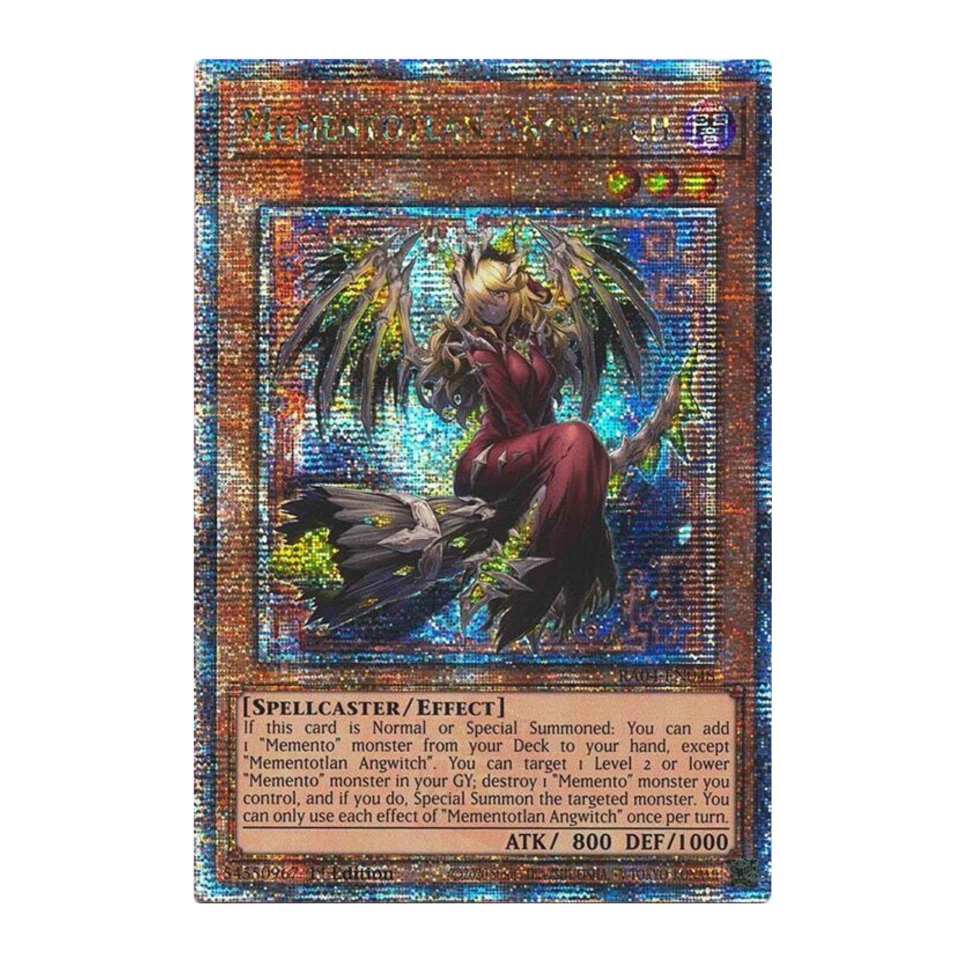 If this card is Normal or Special Summoned: You can add 1 "Memento" monster from your Deck to your hand, except "Mementotlan Angwitch". You can target 1 Level 2 or lower "Memento" monster in your GY; destroy 1 "Memento" monster you control, and if you do, Special Summon the targeted monster. You can only use each effect of "Mementotlan Angwitch" once per turn.