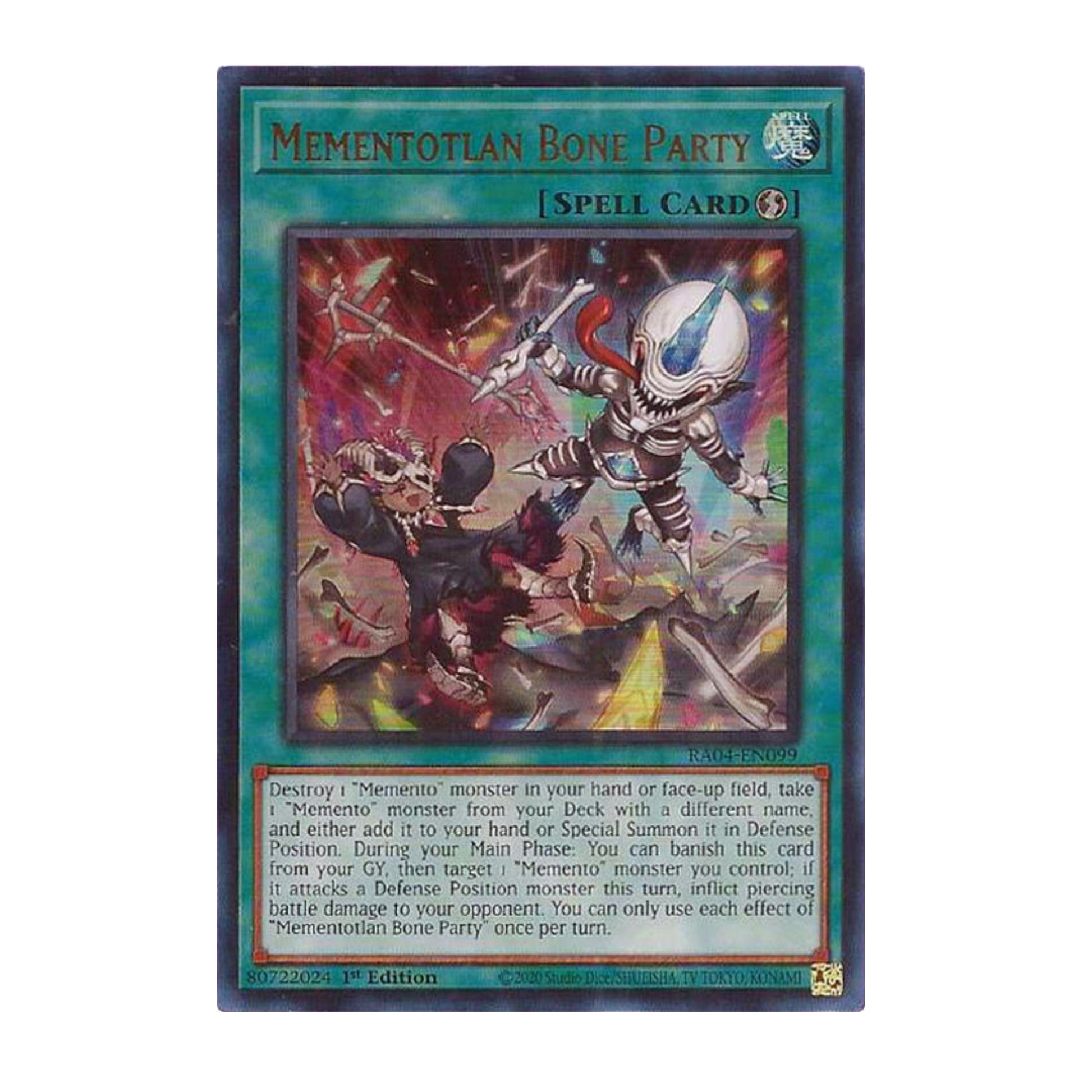 Destroy 1 "Memento" monster in your hand or face-up field, take 1 "Memento" monster from your Deck with a different name, and either add it to your hand or Special Summon it in Defense Position. During your Main Phase: You can banish this card from your GY, then target 1 "Memento" monster you control; if it attacks a Defense Position monster this turn, inflict piercing battle damage to your opponent. You can only use each effect of "Mementotlan Bone Party" once per turn.