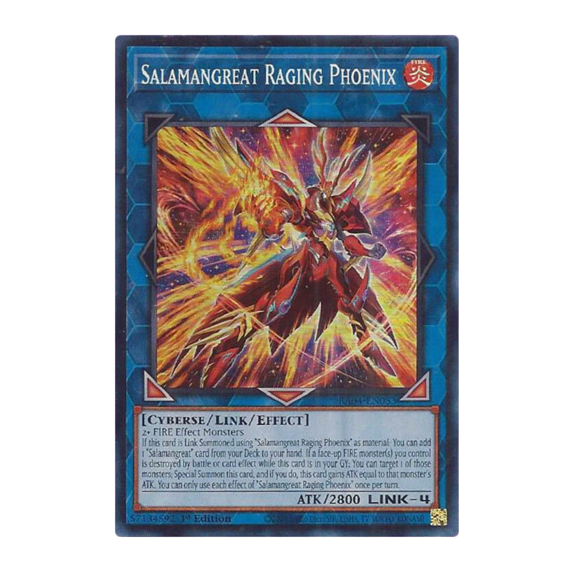If this card is Link Summoned using "Salamangreat Raging Phoenix" as material: You can add 1 "Salamangreat" card from your Deck to your hand. If a face-up FIRE monster(s) you control is destroyed by battle or card effect while this card is in your GY: You can target 1 of those monsters; Special Summon this card, and if you do, this card gains ATK equal to that monster's ATK. You can only use each effect of "Salamangreat Raging Phoenix" once per turn.