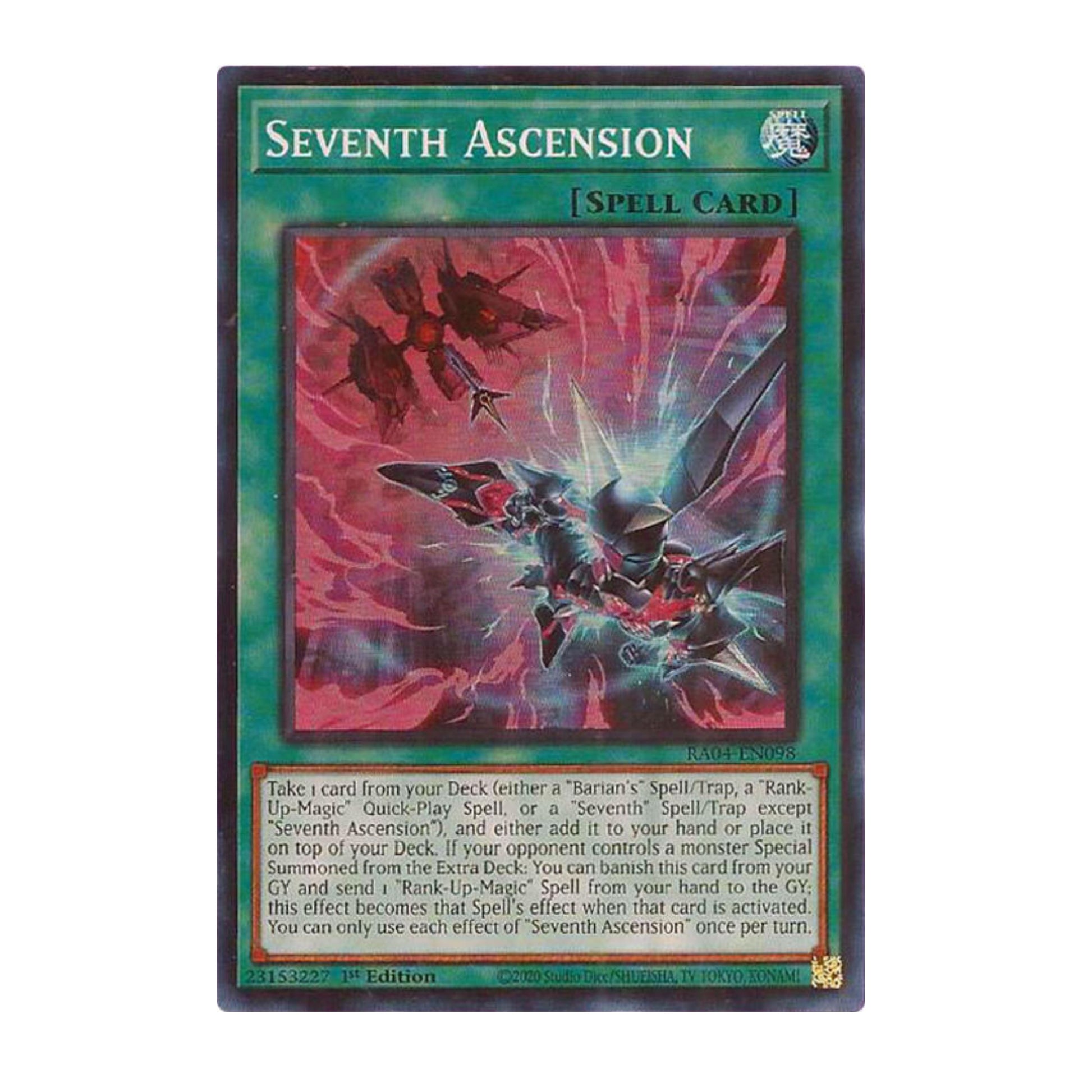 Take 1 card from your Deck (either a "Barian's" Spell/Trap, a "Rank-Up-Magic" Quick-Play Spell, or a "Seventh" Spell/Trap except "Seventh Ascension"), and either add it to your hand or place it on top of your Deck. If your opponent controls a monster Special Summoned from the Extra Deck: You can banish this card from your GY and send 1 "Rank-Up-Magic" Spell from your hand to the GY; this effect becomes that Spell's effect when that card is activated. You can only use each effect of "Seventh Ascension" once per turn.