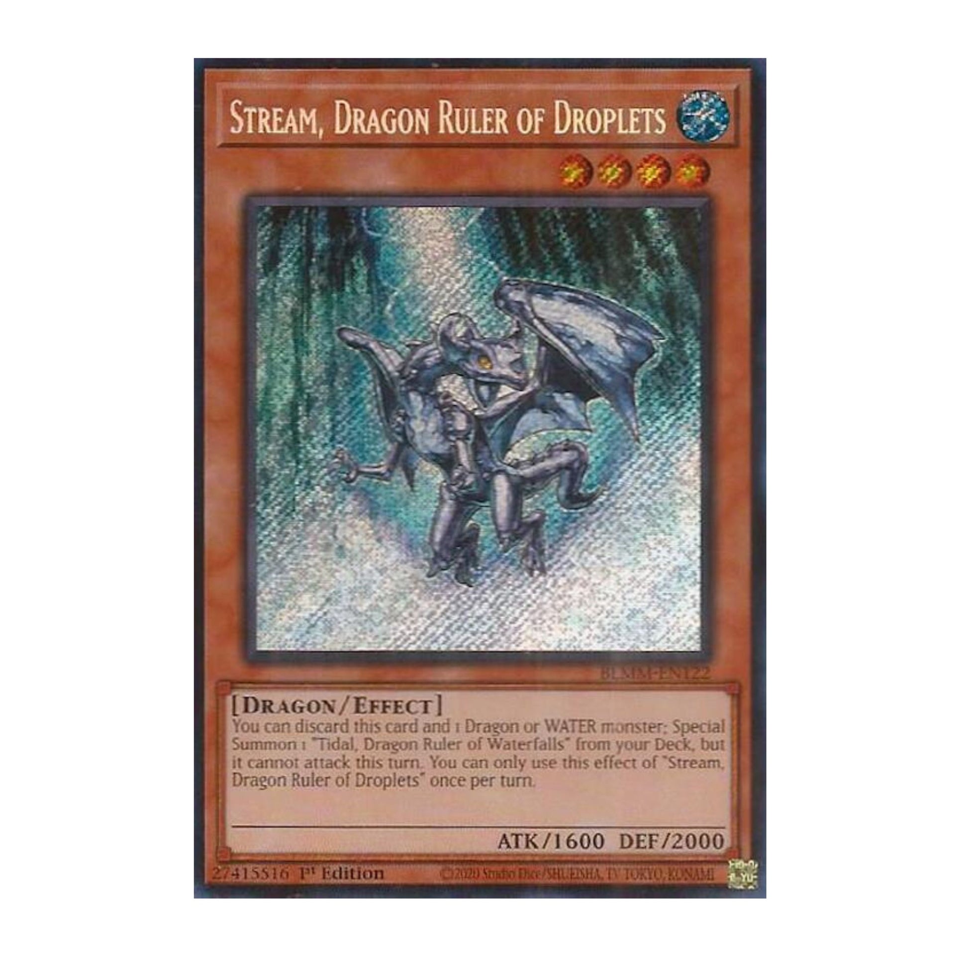 You can discard this card and 1 Dragon or WATER monster; Special Summon 1 "Tidal, Dragon Ruler of Waterfalls" from your Deck, but it cannot attack this turn. You can only use this effect of "Stream, Dragon Ruler of Droplets" once per turn.